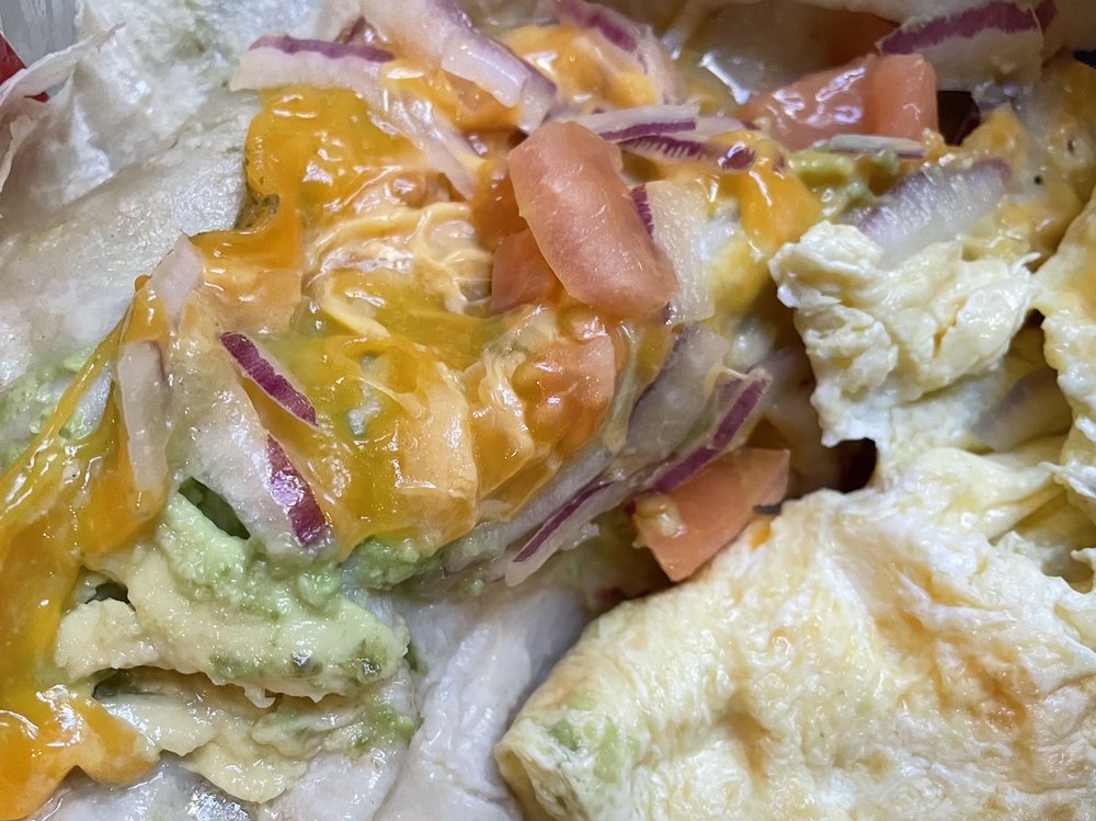 3 eggs, smoked bacon, white American cheese, avocado, pickled jalapeos, crispy tater tots, cotija cheese, chipotle aioli; side of hot sauce.