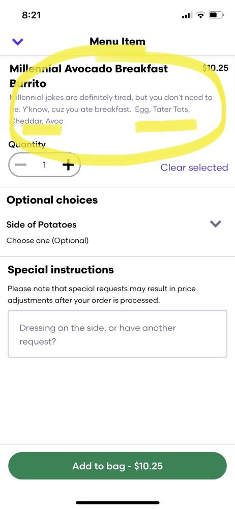 3 eggs, Beyond Sausage, American cheese, crispy tater tots, tomato, avocado, arugula, spicy basil aoili; side of hot sauce